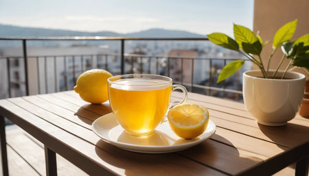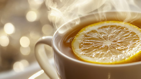 A steaming cup of lemon tea sits on a table, with a slice of lemon floating on top. The warm drink emits fragrant steam, creating a cozy ambiance on a bright day.