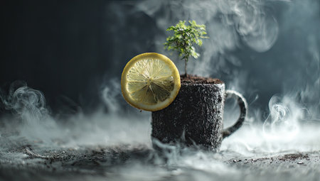 Close-up image of a dark gray textured ceramic mug, filled with soil and hosting a small plant, and a lemon slice resting on top. The mug is situated on a dark surface, and smoke is visible in the background. The lighting and composition create a dramatic and aesthetic visual effect.