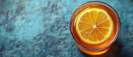 A close-up top view of a glass of iced tea with a fresh lemon slice, placed on a textured blue surface. A vibrant, probiotic-rich herbal drink with digestive benefits.