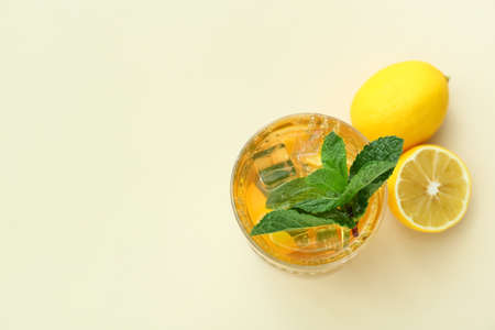 Raw fermented homemade alcoholic or non alcogolic kombucha superfood. Ice tea with healthy natural probiotic in glass with lemon slice and mint on yellow background. Hard shadow