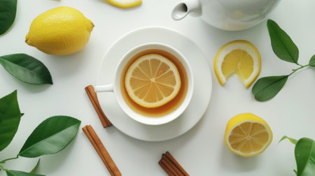 a cup of herbal tea cinnamon sticks on a saucer lemon teapot and leaves on a white table generative ai