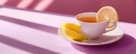 Mockup. Hot lemon tea on a pastel purple background, offering a soothing and elegant backdrop for your creative projects.