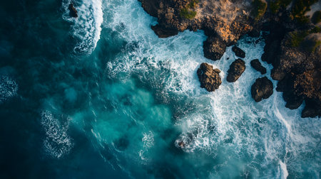 Captivating aerial image showcasing dynamic ocean waves as they crash against rugged rocks, creating foam and stunning textures in a vibrant seascape.