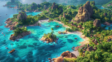 An aerial view of a coastal beach with rocks, surrounded by electric blue water. Natural landscape with oceanic and fluvial landforms, including reefs and lakes AIG50