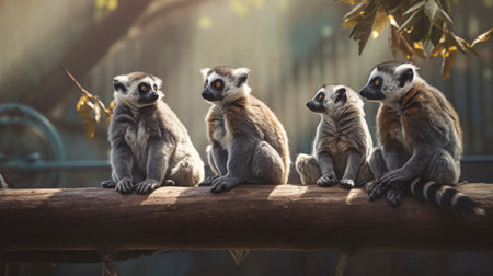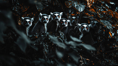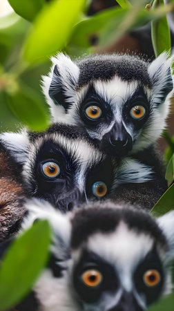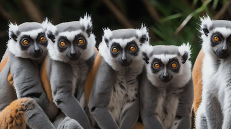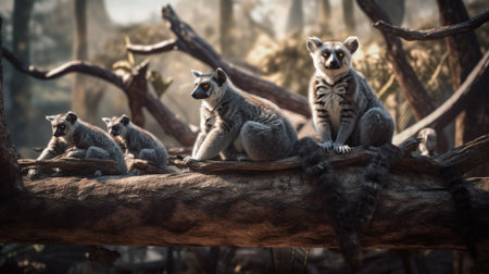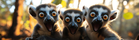 Group of excited lemurs in a forest, wideeyed and playful, closeup shot
