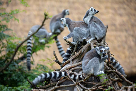 Group of Ring-tailed lemurs are sitting on a tree branch in Nakhon Ratchasima or Korat zoo, Thailand.