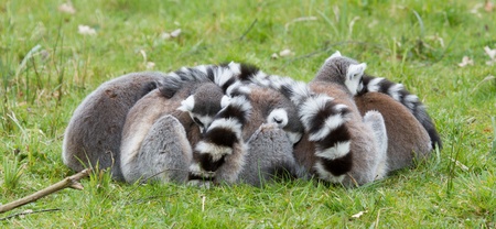Group of ring-tailed lemurs (lemur catta) huddling together. Parc des Felins, Lumigny-Nesles-Ormeaux, France