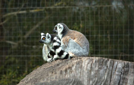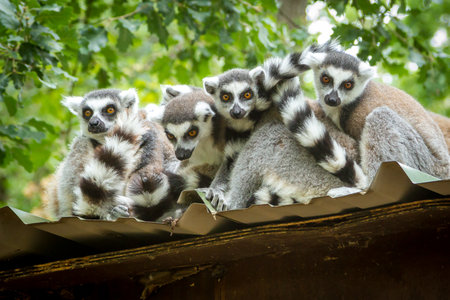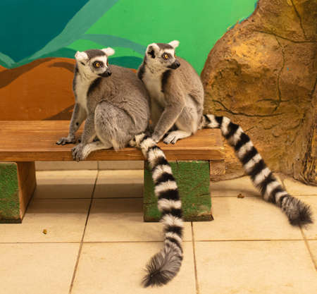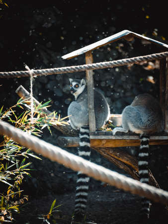 Image of Lemurs with striped tails seating on the fence in Athens, Greece