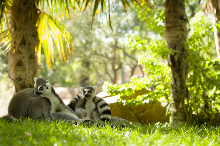 Family of ring tailed lemurs (catta lemurs) in a grass. Popular animals of monkey species. Black and white animal. Group of ring tailed lemurs - catta lemus.