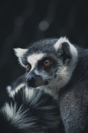 Close up photo of ring tailed lemur. Cute animal with protruding muzzle and orange eyes