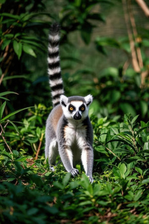 Lemur ringtailed primate wildlife animal closeup portrait of a curious ringtailed lemur standing on hind legs, reaching with paws, showing soft fur texture and bright expressive eyes.
