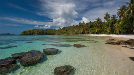 Tropical island paradise with white sand beach and turquoise waters awaiting relaxation