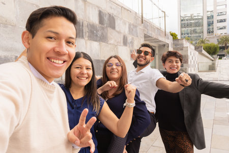 Group of four happy and pretty latino girls from Ecuador posed at street.