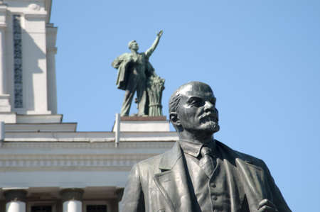 Moscow, Russia - August 01, 2018: Monument to Vladimir Lenin closeup against blue sky on Exhibition of Achievements of National Economy (VDNH) in Moscow on a sunny summer morning