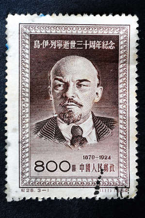 CHINA - CIRCA 1954: A stamp printed in China shows a Portrait of Vladimir Ilyich Lenin with the inscription 1870 - 1924 from the series Anniversary of Lenin's death, circa 1954
