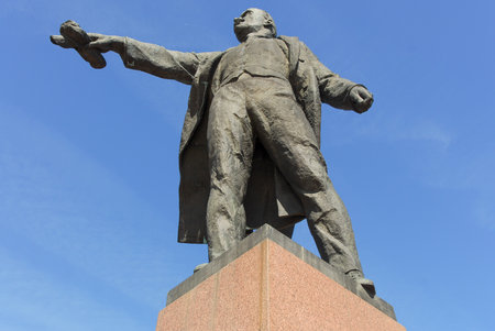 Sculpture of Vladimir Ilyich Lenin in the town square. Concept for printing leaflets, banners, cards, with place for text. SAINT-PETERSBURG, RUSSIA - 7 APRIL 2019.