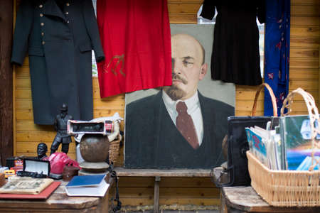 Moscow, Russia - 14 September 2020, Izmailovsky antique market. Old things for sale. Portrait of Lenin for sale