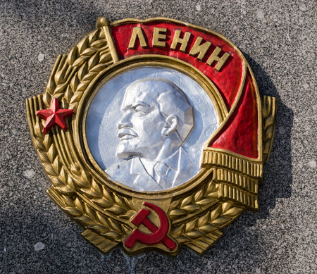 November 1, 2025, Dnipro, Ukraine - An old, faded portrait of Vladimir Lenin, mounted on a red wooden stand, a symbol of the Soviet era, history, ideology, and propaganda