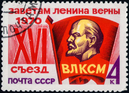 Saint Petersburg, Russia - February 20, 2020: Stamp issued in the Soviet Union dedicated to the 16th Congress of Communist youth, circa 1970