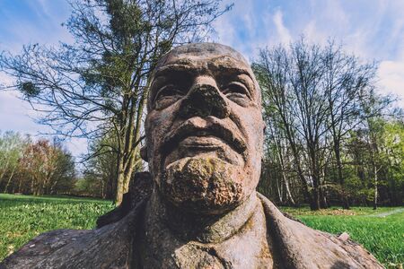 April, 10th, 2017 - Potsdam, Brandenburg, Germany. Abandoned Lenin stone bust in Volkspark in Potsdam. Russian communist Vladimir Lenin sculpture, wide angle close-up view.