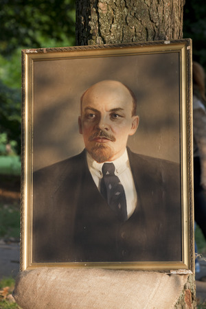 Karelia, Russia - May 1, 2016: Exposed on the street of Vladimir Lenin portrait oil on canvas in a gilt frame, next to the ancient and rusty hand saw.