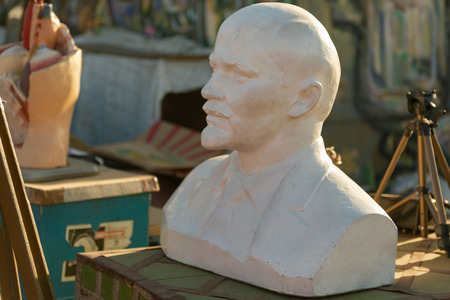 Flea market. Sale of old things. Lenin's bas-relief is being sold on the market.