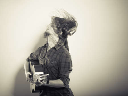 Music hobby passion concept. Enthusiast playing the instrument. Musician is giving the performance with his guitar.