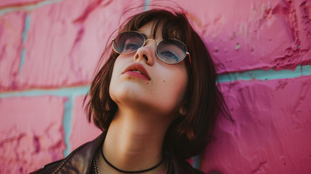 Portrait of young beautiful hipster woman in sunglasses against pink wall