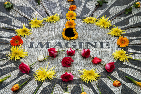 John Lennon memorial with flowers making the peace symbol at Strawberry Fields in Central Park in New York.