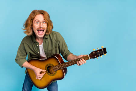 Portrait of attractive cheerful funky guy playing guitar rock hit singing having fun isolated over pastel blue color background