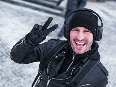 Young sexy man in leather jacket and sunglasses standing outdoor. Dark key photo.