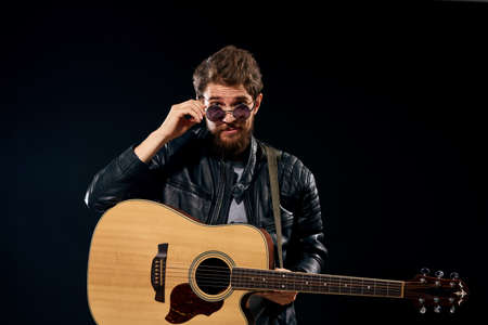 A man holds a guitar in his hands music emotions black leather jacket dark glasses studio light background