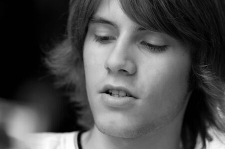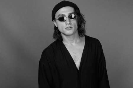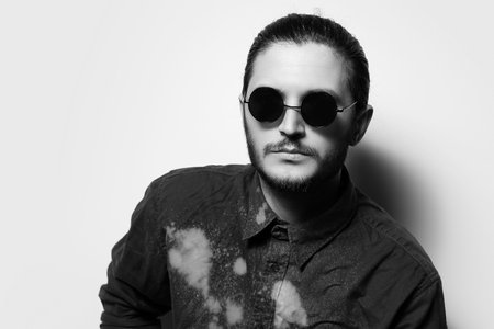 A young man with a beard, wearing a beanie and sunglasses, gazes upward with a thoughtful expression in a high-contrast black and white portrait.