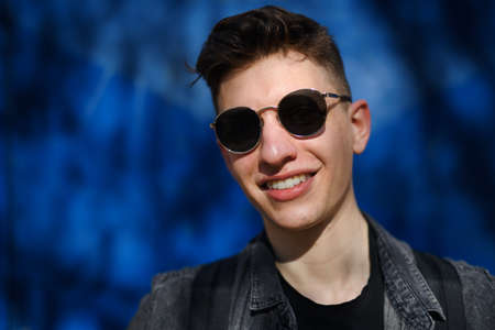 Portrait of young man with sunglasses standing outdoors against blue background, looking at camera.