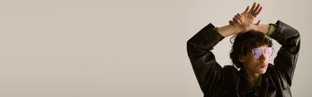 A young man looks upwards while wearing fashionable sunglasses in an urban setting during golden hour light.