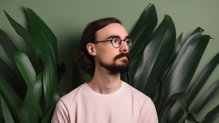handsome young man in eyeglasses looking at camera while standing near green monstera leaves