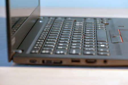 Close up red led backlit computer laptop keyboard keypad with dual alphabet, English and Cyrillic, high angle view