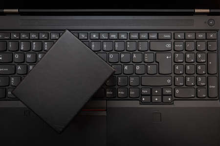 Usb Flash drive on the laptop keyboard.Dark image shot.