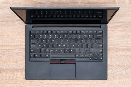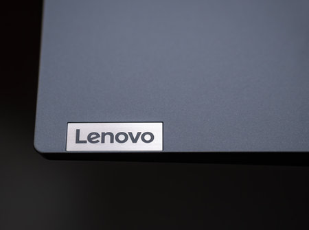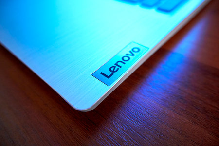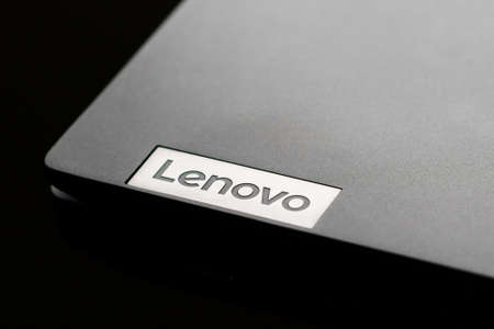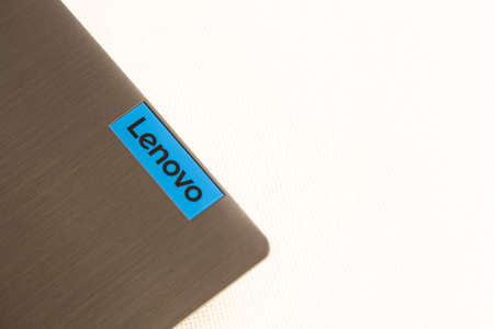 Ryazan, Russia - October 13, 2021: Lenovo logo on laptop close up shot