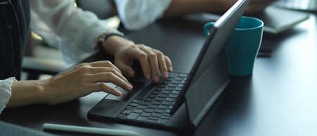 Side view of female hands typing on digital tablet keyboard on meeting table