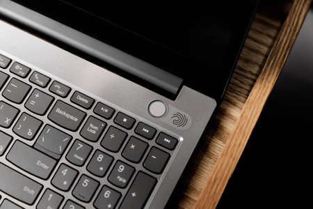 The laptop screen on the table is open. Key word on wooden cubes on laptop. Photographs were taken in the spotlight.