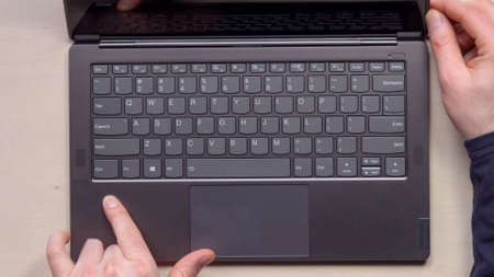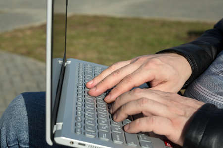 Male hands on a laptop keyboard typing text, the concept of a freelancer's work in the fresh air.
