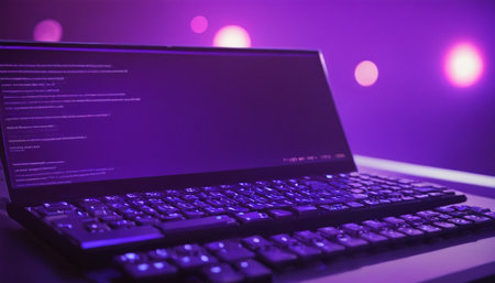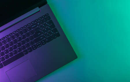 Close up of laptop keyboard colorful neon illumination, backlit keyboard.