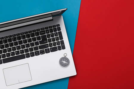 Laptop and compass on red-blue background. Travel or online business concept. top view
