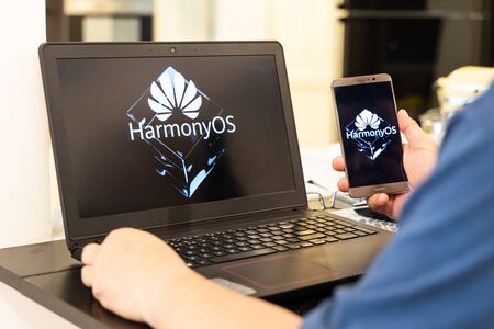 KUALA LUMPUR, MALAYSIA, August, 11, 2019: Huawei officially announced its new operating system, HarmonyOS. Illustrative of developer developing HarmonyOS on computer and smartphone screen.
