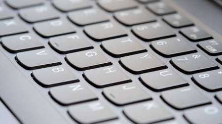 Simple new clean silver gray modern laptop keyboard, nobody, wide shot, shallow DOF, no people, angle. Creative content writing online freelance jobs symbol, abstract concept, blogging, SEO articles