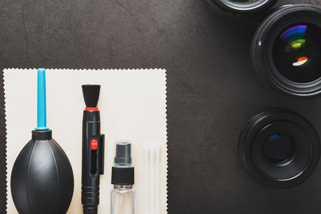Tools for cleaning the camera with lenses on a dark textured background. Set for care of a photo-video camera. Top view, free space.