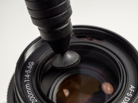 A camera lens is being cleaned with dust blower, focusing on lens surface. blower has green nozzle, and background is white, emphasizing cleaning process