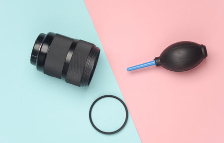Lens with a cleaning bulb and a light filter on a blue-pink background. Caring for photographic equipment