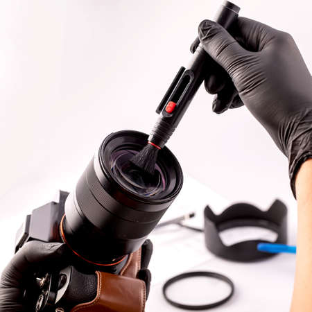 A girl photographer in gloves cleans the lens with special tools for cleaning professional optics. Care for photo equipment.